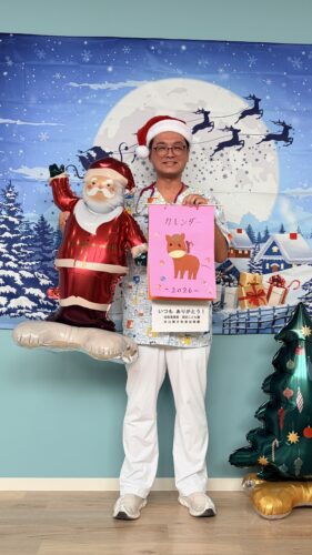 サンタの格好をして、当院スタッフの手作りのお返しを渡しました。